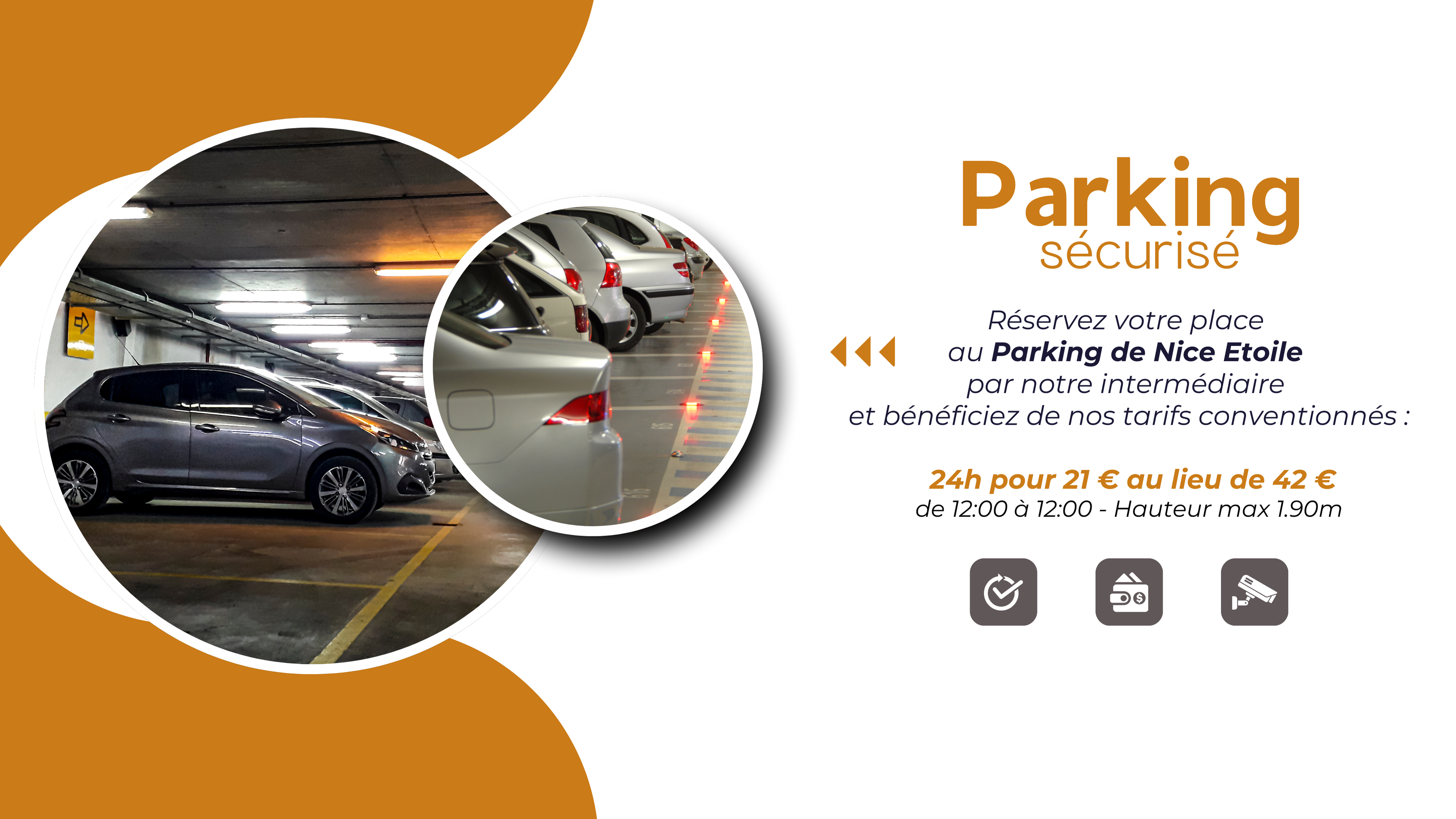 - Spaces in the Nice Etoile Public Car Park upon reservation and subject to availability: 23 EUR per night (Maximum height 1.90m)
