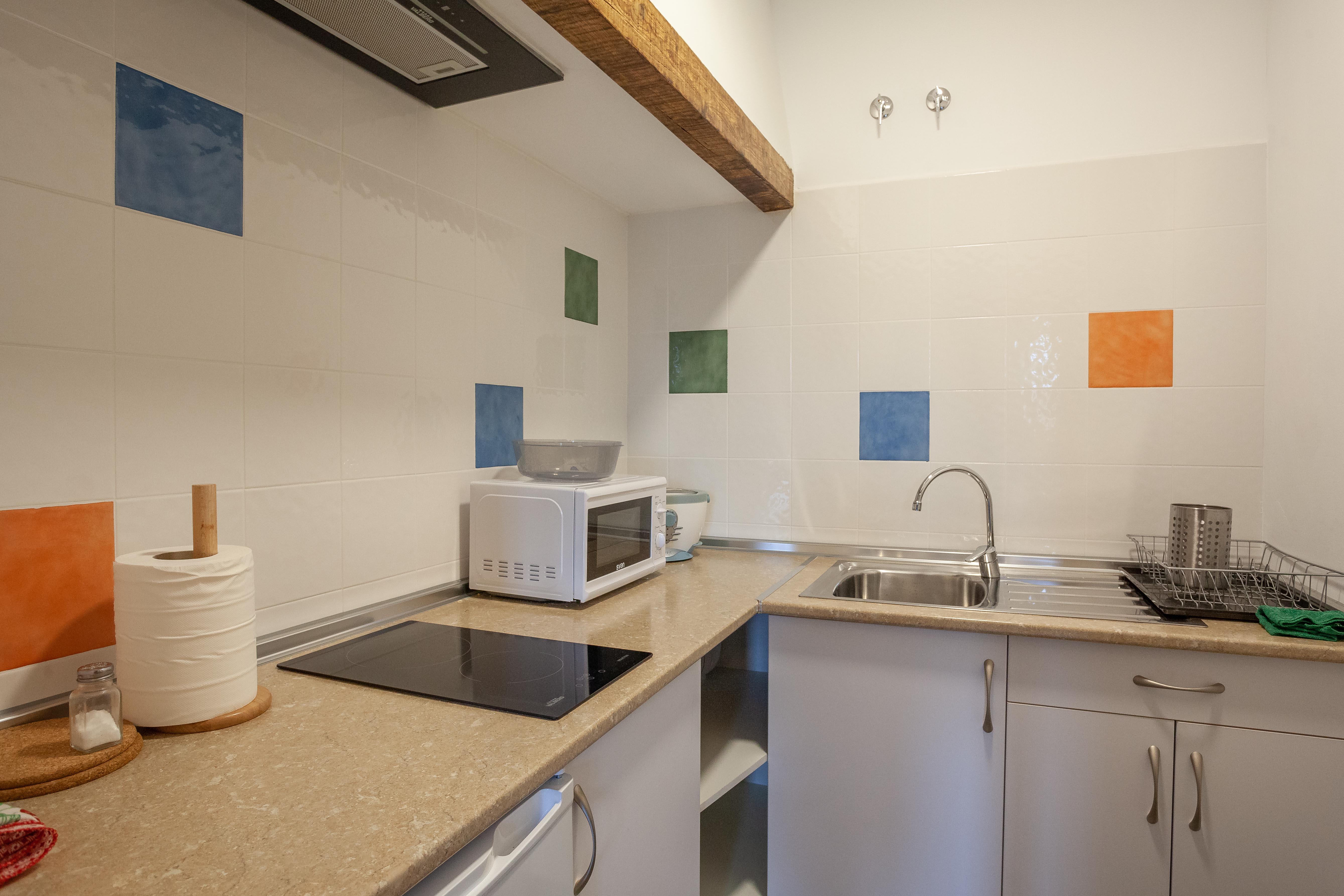 Esta habitación dispone de una pequeña cocina equipada con microondas, vitrocerámica, frigorífico y resto de enseres comunes como platos, vasos, etc.