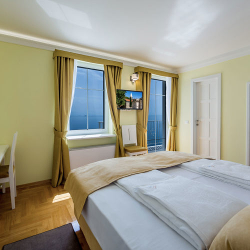 Camera matrimoniale / doppia con letti singoli dotata di balcone, aria condizionata e vista.